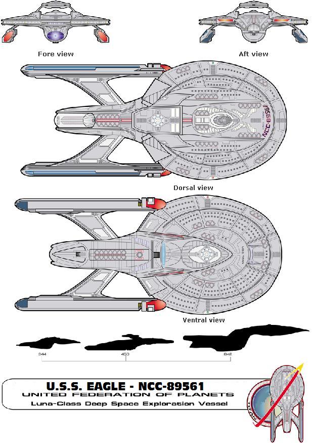 The Luna-class, was orginally designed in the 2370's. Initially, it was to be the premier ship in scientific exploration. It's production was delayed by the Dominion War. The first of it's class, the U,S.S. Luna was launched in 2377, but was destroyed by a warp core breach. All of the initial ships of this class were named after moons. The U.S.S. Titan, commanded by Captain William T. Riker, was one of these ships. The Eagle is the first of the refit of the Luna-class. It is still designed for deep space exploration, and can travel further with the addition of the slip-stream core. It also includes the sub-mode feature of it's Intrepid-class predecessor. This feature will allow the physical appearance of the ship be changed by holographic means through the shield emittors. The continued downfall to this technology is it also leaves the ship whit only navigational shields until sub-mode is disengaged. | |
