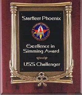 The Board of Admirals, has felt it necessary to, from time to time, recognise our sims (or simmers) for their dedication to the RFG. Therefore, we have come up with the "Exccelence In Simming" award. The criteria for this award is not just the number of posts which a sim puts on the message board, but the quality of the storyline as well as simmer participation. We feel it is these qualities which keep a sim going strong. The first such recipient of this award is the USS Challenger sim. Inaddition to receiving the above trophy, which can be posted to their individual web page(s), their names shall be forever denoted below with a placque bearing their name.